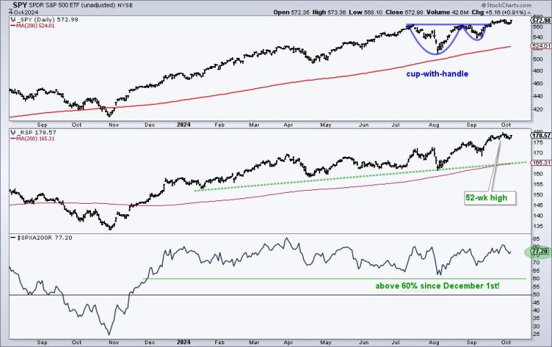 Finally, we can use point & figure charts to create a breadth indicator called the Bullish Percent Index. Over the last couple weeks, this indicator has pushed above 80%, which represents one of the highest levels in recent years. This confirms that four out of every five S&P 500 members are showing a bullish signal on their point & figure charts.